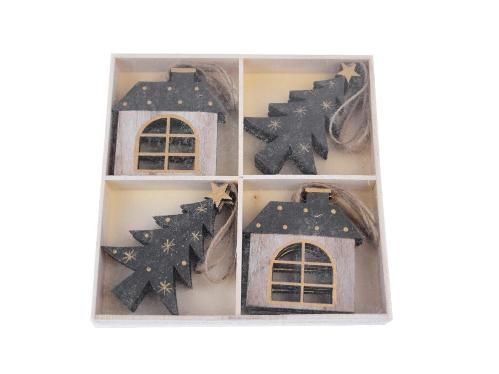 Závěs strom/domeček, MDF, natur/černá, 5,5x7x0,5cm, box 12ks|Ego dekor
